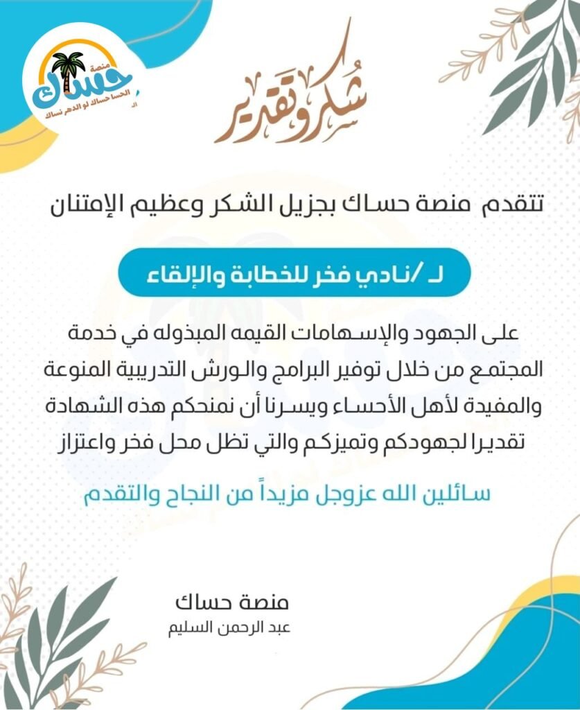 حساك المنصة الأولى في الأحساء تهتم في نشر فعاليات وأنشطة الأحساء و كذلك الإعلانات الخاصة بالأفراد والمؤسسات والشركات