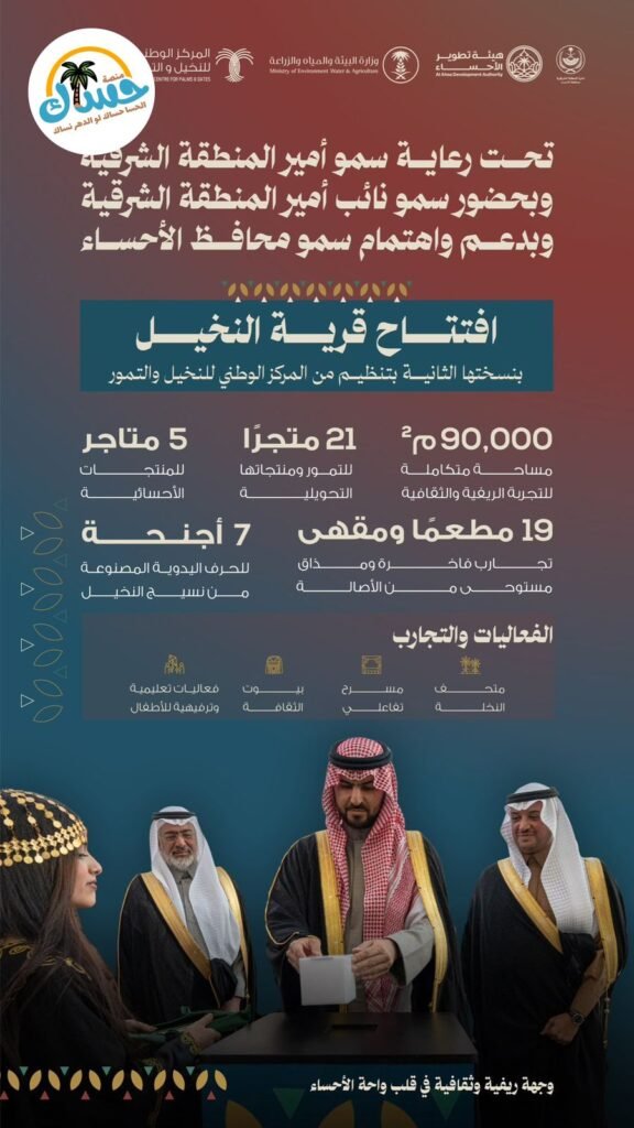 حدث ثقافي وريفي شامل يُقام برعاية أمير المنطقة الشرقية ونائبه ومحافظ الأحساء، وبتنظيم من المركز الوطني للنخيل والتمور. تبلغ مساحة القرية 90,000 متر مربع، وتوفر تجربة ريفية وثقافية متكاملة. تضم 21 متجرًا للتمور ومنتجاتها التحويلية، بالإضافة إلى 5 متاجر للمنتجات الأحسائية. تحتوي على 19 مطعمًا ومقهى فاخرًا، و7 أجنحة للحرف اليدوية المصنوعة من نسيج النخيل. تشمل الفعاليات متحف النخلة التفاعلي، وبيوت الثقافة، وأنشطة تعليمية وترفيهية للأطفال.