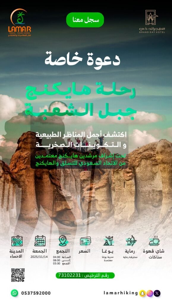 ندعوكم للانضمام إلينا في تجربة هايكنج ممتعة ومميزة في جبل الشعبة بالأحساء.