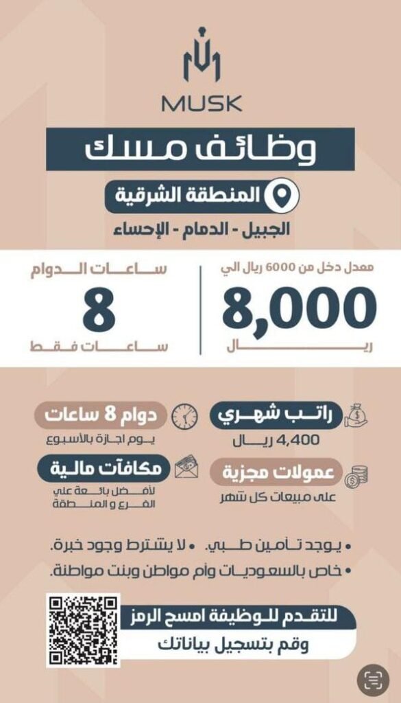 تعلن شركة MUSK عن توفر وظائف شاغرة للعمل في المنطقة الشرقية (الجبيل – الدمام – الأحساء – مكة – جدة).