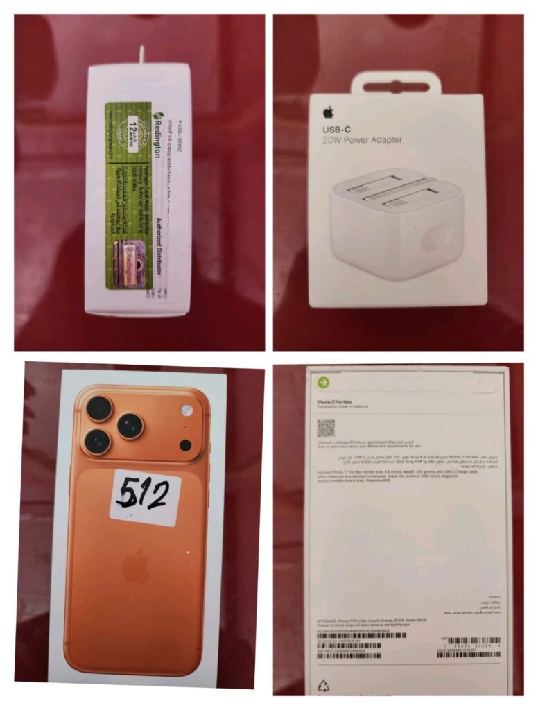 للبيع آيفون 17 برو ماكس، 512 غيغا مع رأس شاحن أصلي. الجهاز جديد بكرتونه لم يفك. اللون برتقالي.