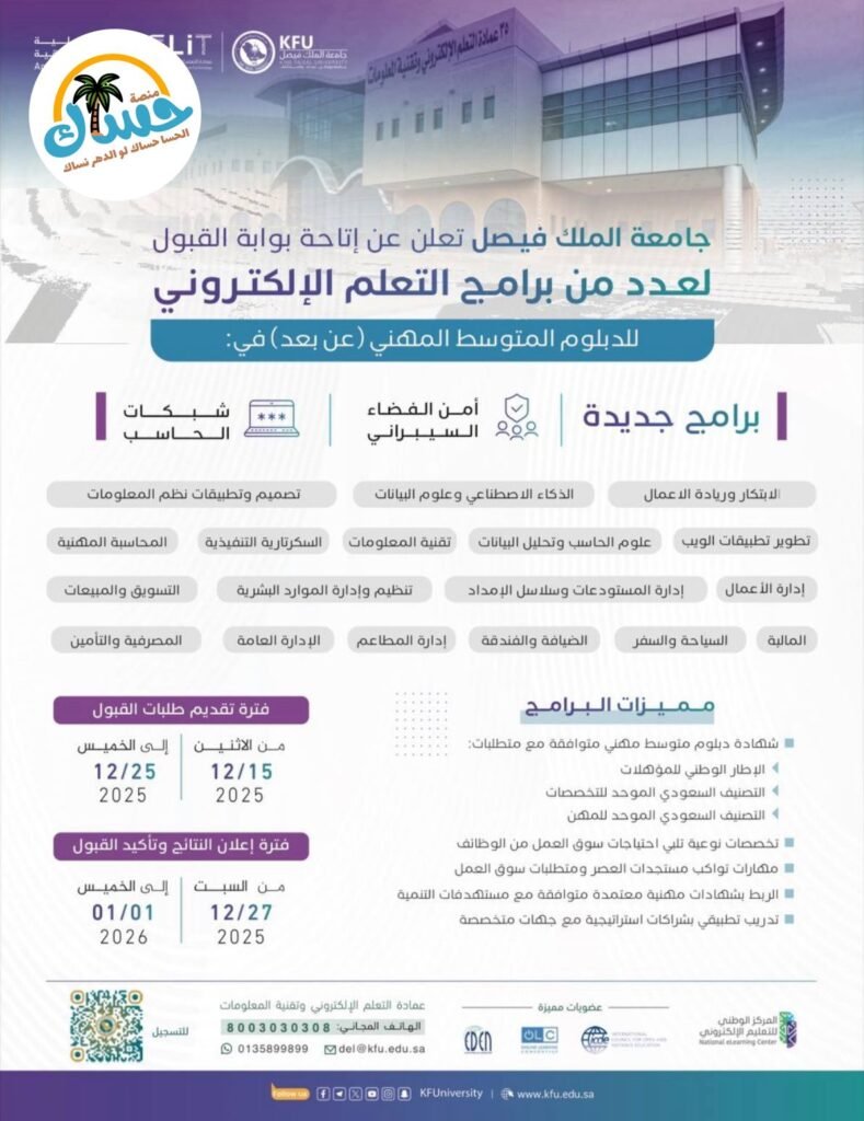تعلن جامعة الملك فيصل عن فتح باب القبول في الدبلومات المهنية المدفوعة للعام ١٤٤٧هـ.