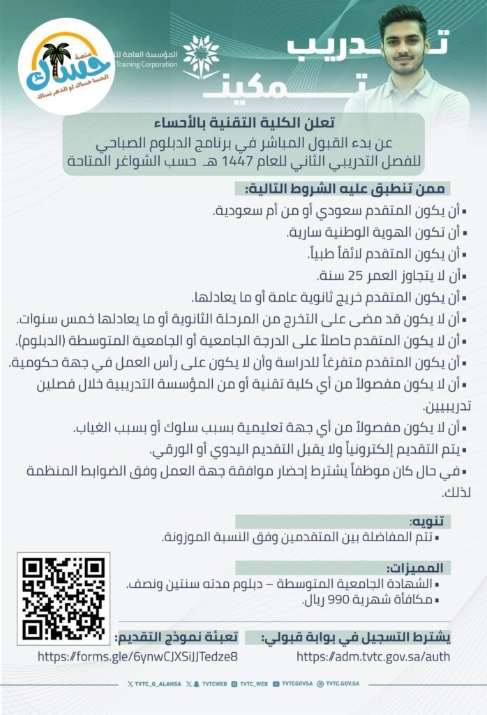 إعلان قبول مباشر في برنامج الدبلوم الصباحي – الكلية التقنية بالأحساء