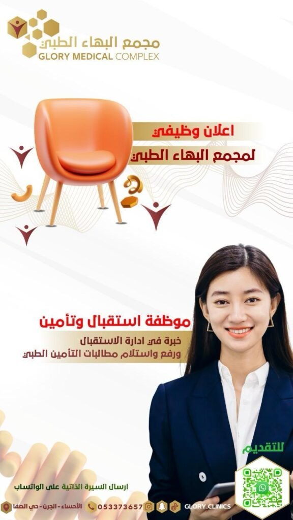 إعلان وظيفي من "مجمع البهاء الطبي" 👌👌الوظيفة: موظفة استقبال وتأمين. 🔥🔥المتطلبات: خبرة في إدارة الاستقبال، ورفع واستلام مطالبات التأمين الطبي.