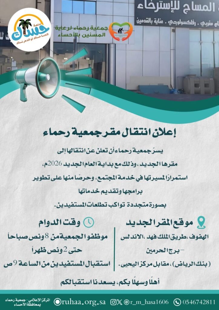 يسر جمعية رحماء الإعلان عن افتتاح موقعها الجديد في حي الخرس، المبرز.