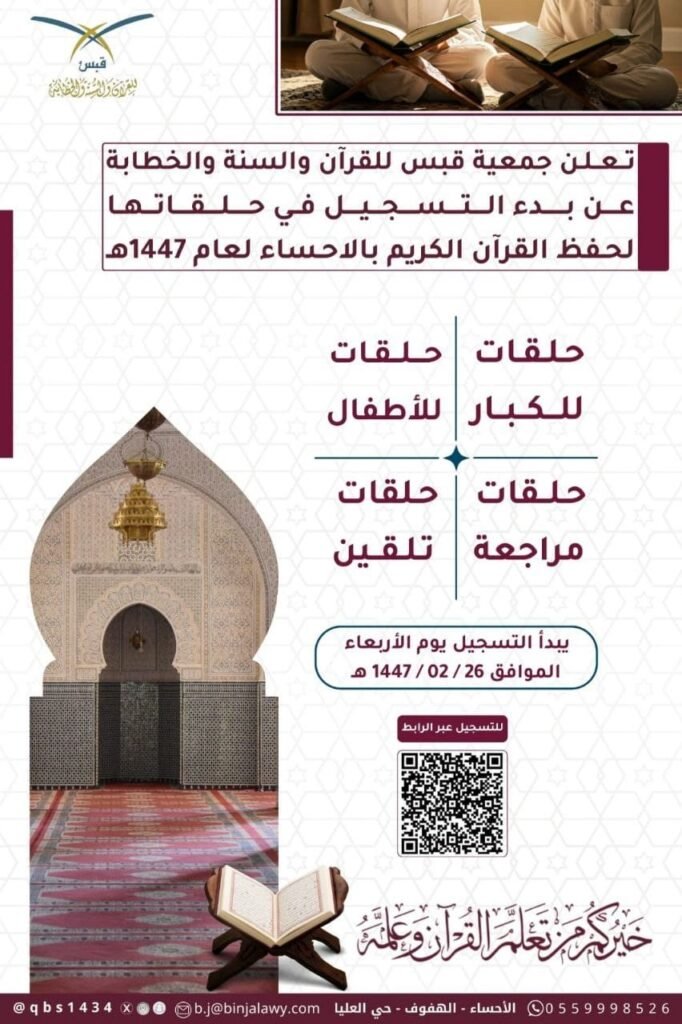 حيث تعلن جمعية قبس للقرآن والسنة والخطابة عن بدء التسجيل في حلقاتها لحفظ القرآن الكريم في الاحساء.