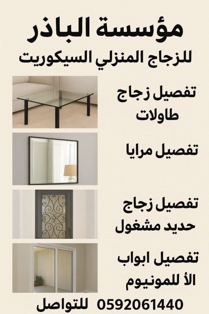 نقدم خدمات تفصيل وتركيب الزجاج للأبواب والنوافذ، أعمال حديد ومونيوم، مرايات وزجاج للطاولات، وصيانة الأبواب والنوافذ المكسورة. خدمة توصيل وتركيب متاحة.