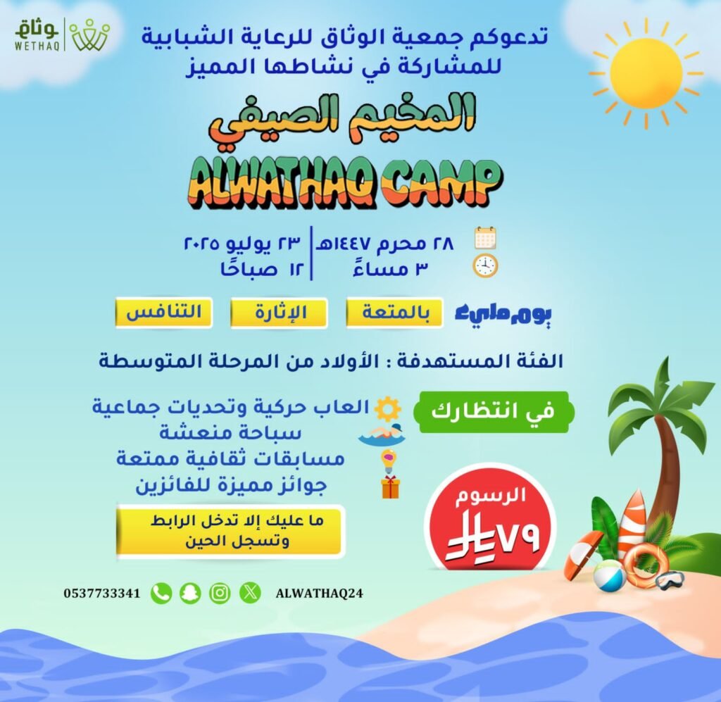 المخيم الصيفي لجمعية الوثاق في بني معن هو برنامج يقدمه جمعية الوثاق في بني معن، ويهدف إلى توفير أنشطة ترفيهية وتعليمية للمرحلة المتوسطة خلال فصل الصيف. يهدف المخيم إلى توفير بيئة ممتعة ومفيدة للأطفال والشباب لتنمية مهاراتهم واكتشاف مواهبهم من خلال مجموعة متنوعة من الأنشطة مثل الرياضة، وورش العمل، والفنون، والرحلات الميدانية.