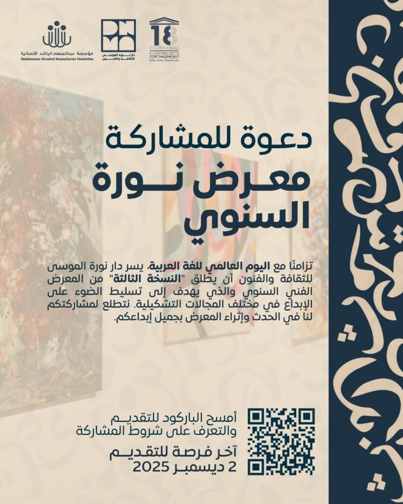 تزامنًا مع اليوم العالمي للغة العربية، يسر دار نورة الموسى للثقافة والفنون أن يطلق “النسخة الثالثة” من المعرض الفني السنوي والذي يهدف إلى تسليط الضوء على الإبداع في مختلف المجالات التشكيلية.