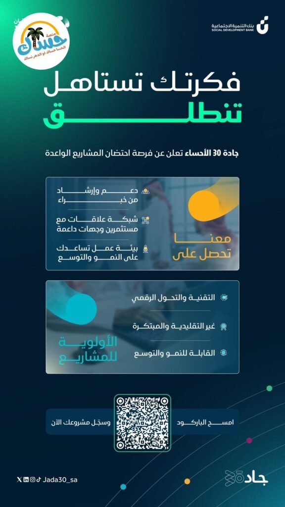 - يمكنك البدء برحلتك الريادية وتسجيل مشروعك الآن عبر مسح رمز الاستجابة السريعة (QR Code) الموضح في الصورة، أو متابعة الحساب الرسمي الموحد Jada30_sa على منصات التواصل الاجتماعي.