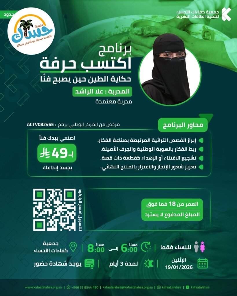 يركز هذا البرنامج المعتمد على فن صناعة الفخار، مقدماً تجربة فريدة في تحويل الطين إلى عمل فني، وهو مرخص من المركز الوطني.