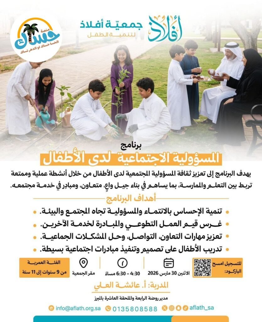 666; line-height: 1.8; margin: 10px 0; font-size: 1em;”>انضموا إلينا في برنامج مميز يهدف إلى تعزيز الثقافة المجتمعية لدى الأطفال من الفئة العمرية من 9 إلى 11 سنة. البرنامج سيبدأ يوم الاثنين 30 مارس 2026، من الساعة 4:30 إلى 6:30 مساءً.