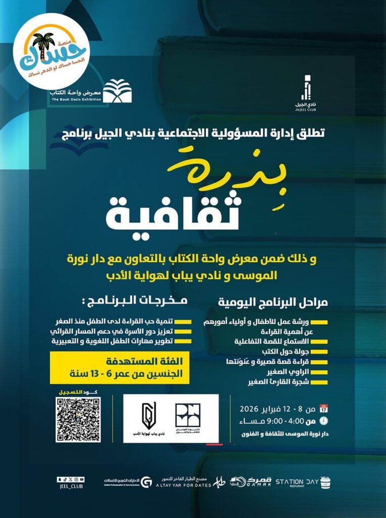 يعقد البرنامج في دار نورة الموسى للثقافة والفنون ضمن معرض واحة الكتاب، ويناسب الجنسين من عمر 6 إلى 13 سنة. يبدأ في 8 فبراير 2026 وينتهي في 12 فبراير 2026، من الساعة 4:00 مساءً إلى 9:00 مساءً.