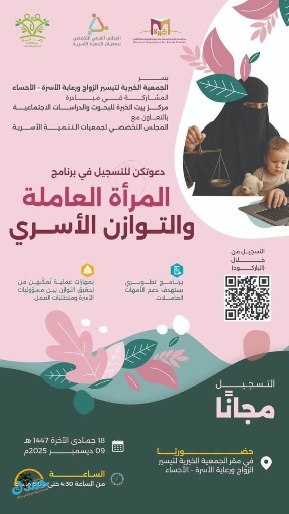برنامج تدريبي يهدف إلى دعم الأمهات العاملات في تحقيق التوازن بين مسؤولياتهن الأسرية ومتطلبات العمل. يقدم البرنامج مهارات عملية لتمكين الأمهات من تحقيق التوازن.