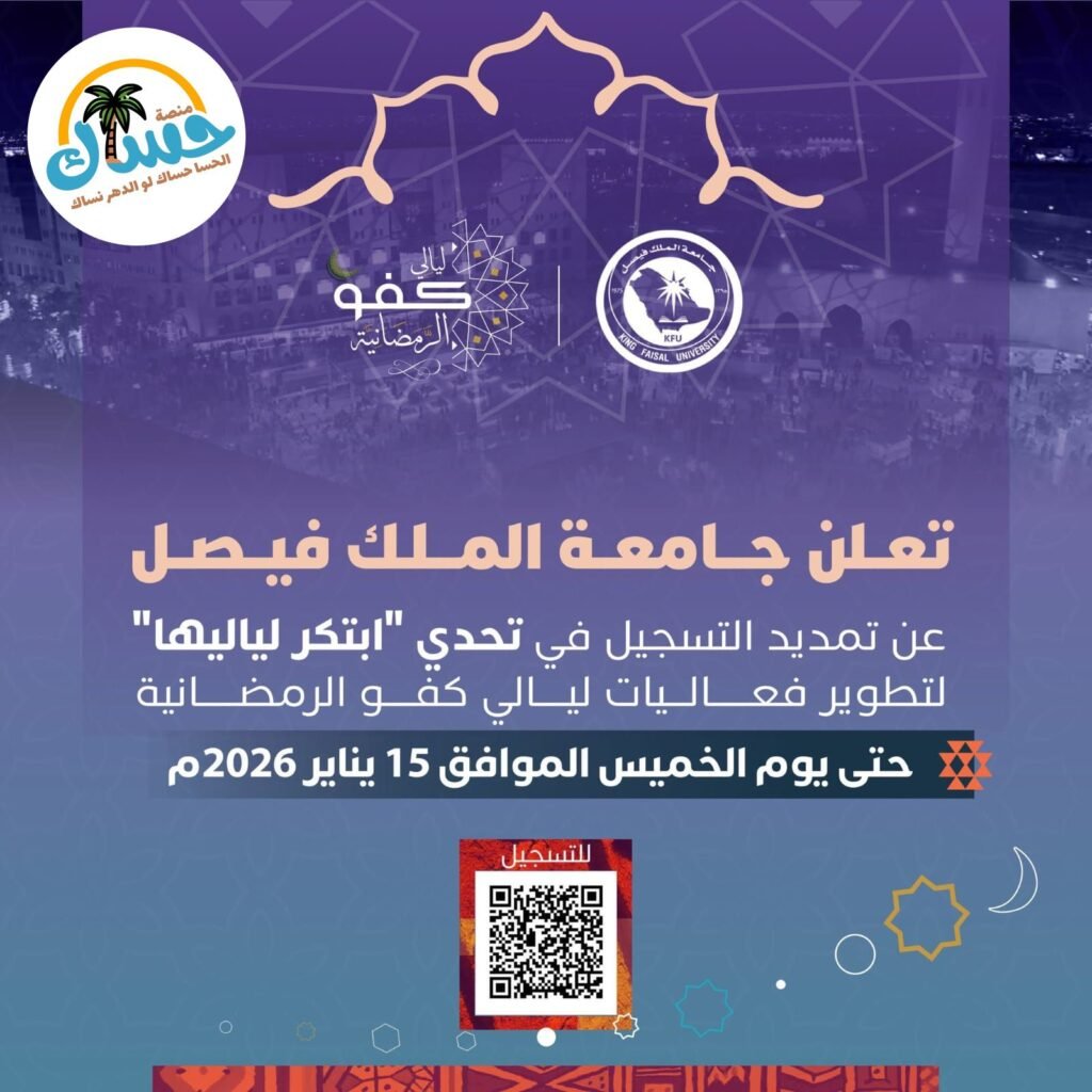 تعلن ليالي كفو الرمضانية عن تمديد فترة التسجيل في تحدي ابتكر_لياليها لتطوير الفعاليات حتى يوم الخميس 15 يناير 2026م. ننتظر أفكاركم للمشاركة.