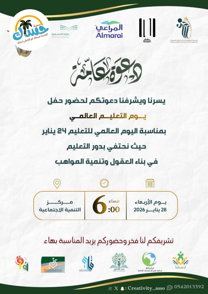 الزمان: يوم الأربعاء 28 يناير 2026، الساعة 6:00 مساءً. المكان: مركز التنمية الاجتماعية. المنظمون والشركاء: الجمعية التعاونية لعدم التعزيز الحوطية، نقش، المراعي، ووزارة التعليم.