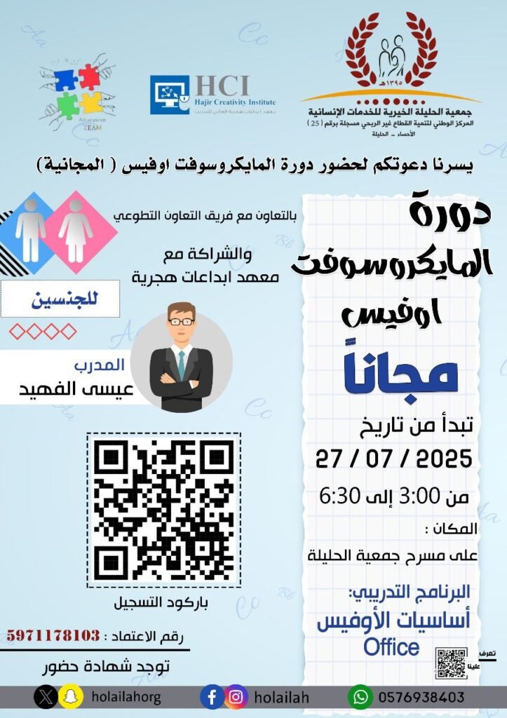 دورة “المايكروسوفت أوفيس”⏰ 3:00 – 6:30 م 📆 الأحد 27 يوليو 2025 في مسرح جمعية الحليلة الخيرية – 🔗للتسجيل: اضغط ع الرابط
