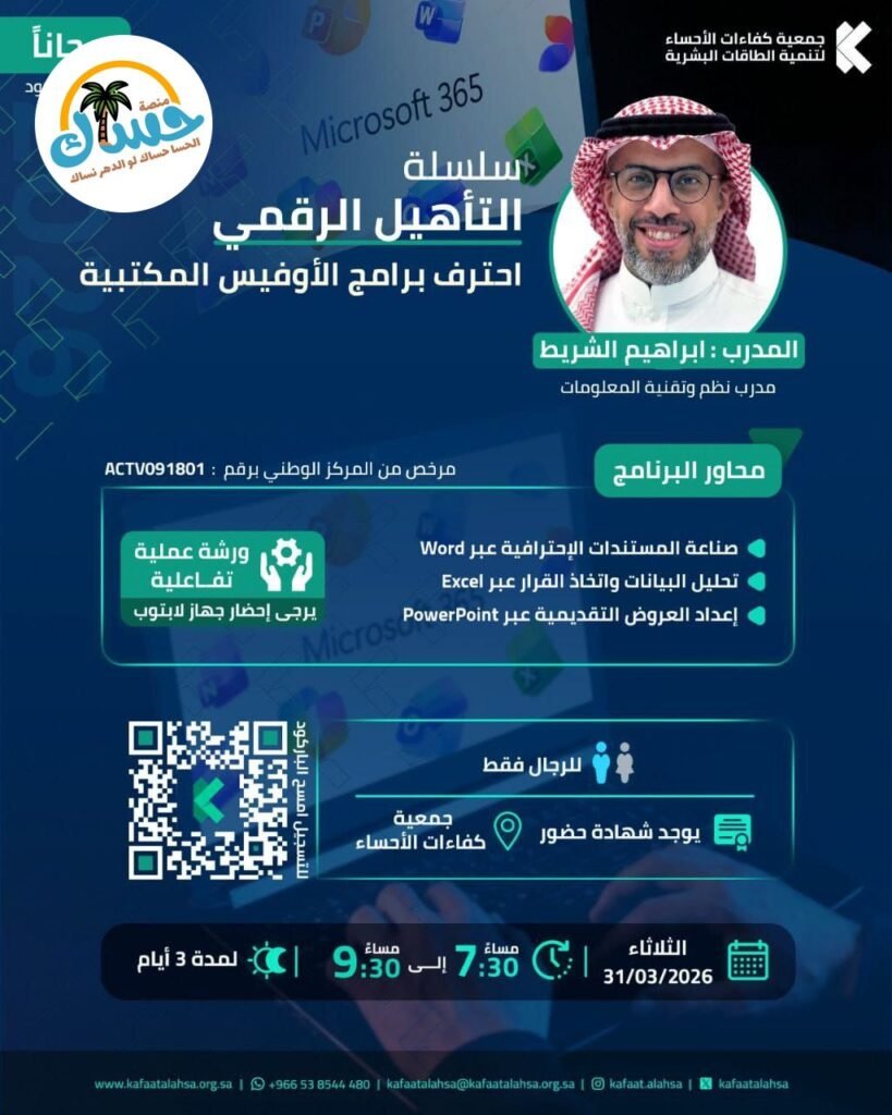 - التفاصيل: الدورة للرجال فقط، تبدأ يوم الثلاثاء 31/03/2026 لمدة 3 أيام، من الساعة 7:30 مساءً حتى 9:30 مساءً، مع وجود شهادة حضور من جمعية كفاءات الأحساء.
