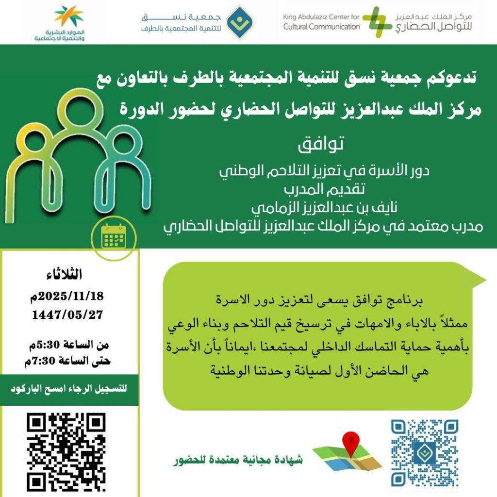 تدعوكم جمعية نسق للتنمية المجتمعية بالطرف بالتعاون مع مركز الملك عبدالعزيز للتواصل الحضاري بالمنطقة الشرقية لحضور دورة (توافق) لتعزيز دور الأسرة في ترسيخ قيم التلاحم الوطني.