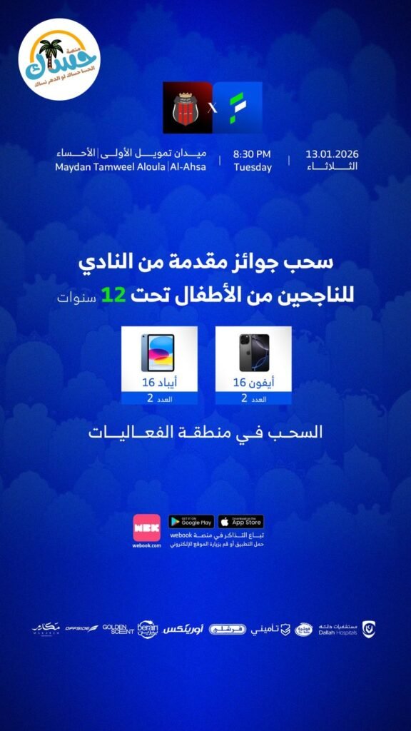 يقدم النادي سحب جوائز مميز للطلاب الناجحين في الأحساء. الجوائز تشمل: جهازي آيباد 16 وجهازي آيفون 16. المؤهلون للمشاركة هم الأطفال الناجحون تحت سن 12 سنة. تقام الفعالية في ميدان تمويل الأولى، الأحساء.