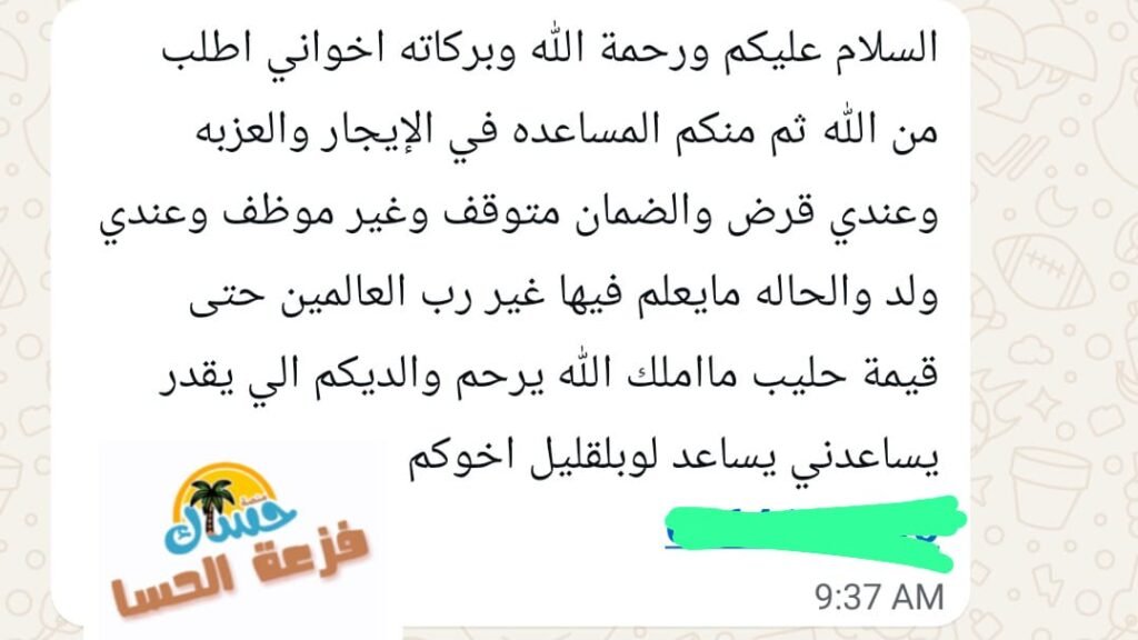 *فزعة الحسا🤝.* . أهل الحسا يوجد شخص محتاج وعنده ظروف وهذه فرصة لمن يبحث عن الأجر..{ وَمَا تُقَدِّمُواْ لأَنفُسِكُم مِّنْ خَيْرٍ تَجِدُوهُ عِندَ اللّهِ إِنَّ اللّهَ بِمَا تَعْمَلُونَ بَصِيرٌ .}