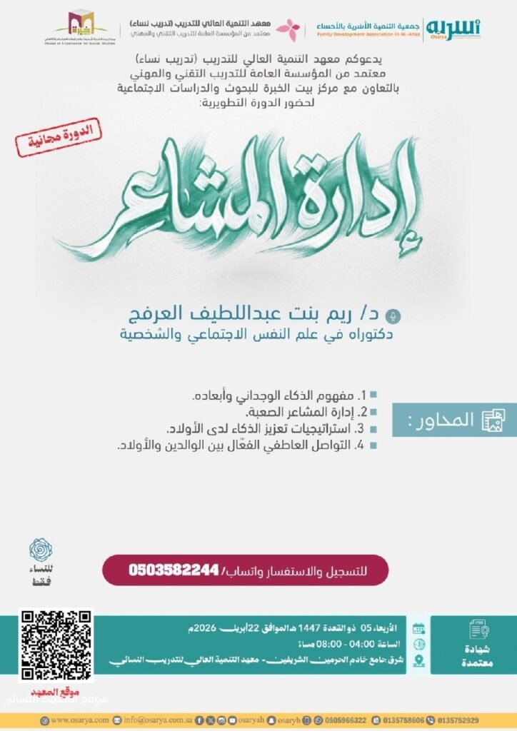 - 👌👌يقدمها معهد التنمية العالي للتدريب (قسم النساء) بالتعاون مع جمعية التنمية الأسرية بالأحساء (أسرية).