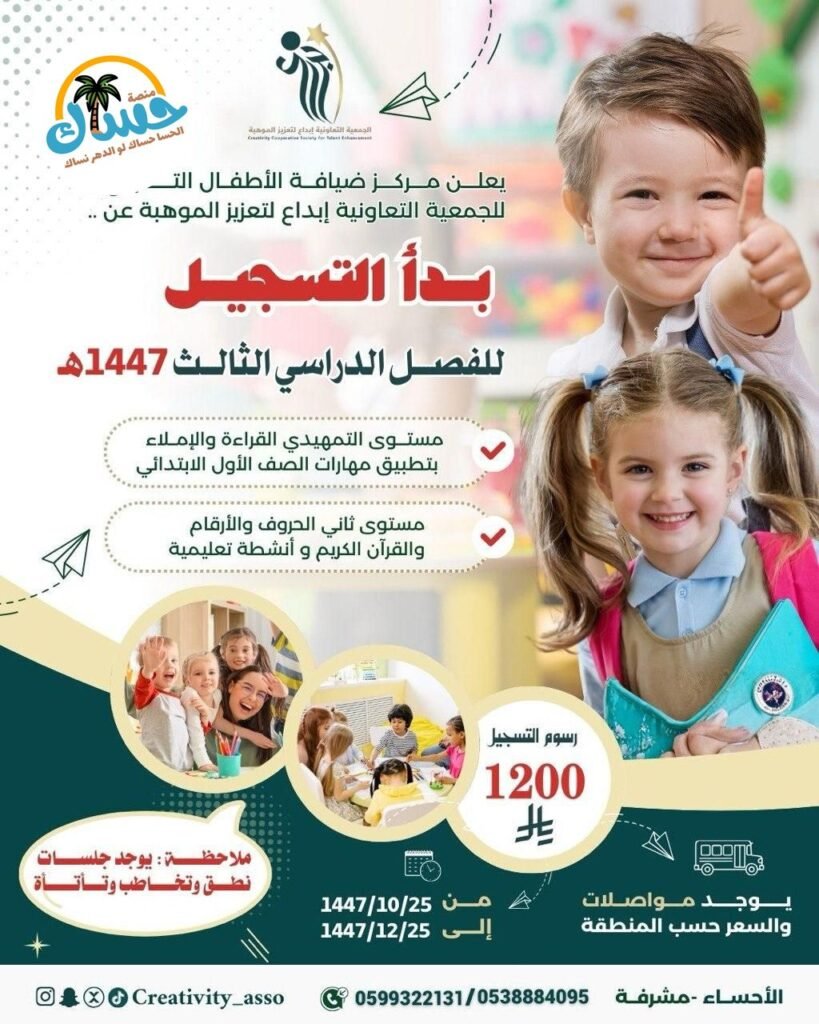 نعلن عن فتح باب التسجيل للفصل الدراسي الثالث لعام 1447هـ في مركز ضيافة الأطفال التابع للجمعية التعاونية ‘إبداع لتعزيز الموهبة’.
