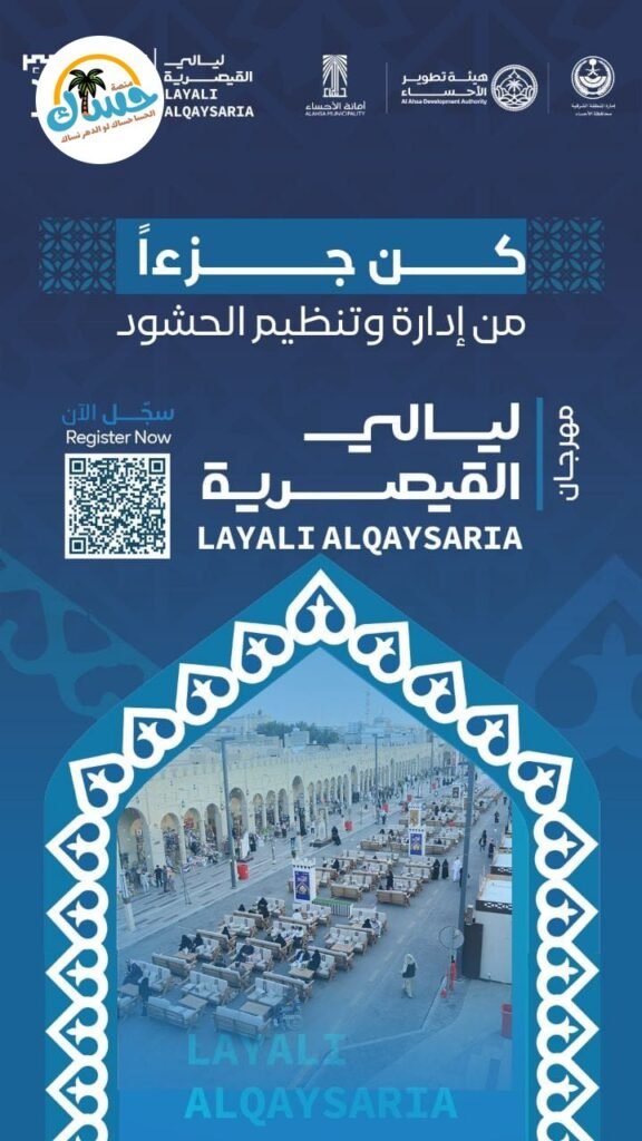 تتوفر فرصة للتطوع في إدارة وتنظيم الحشود خلال مهرجان “ليالي القيصرية” في الأحساء، برعاية هيئة تطوير الأحساء وأمانة الأحساء. التسجيل متاح الآن عبر مسح رمز الاستجابة السريعة (QR code) الموجود في الإعلان.