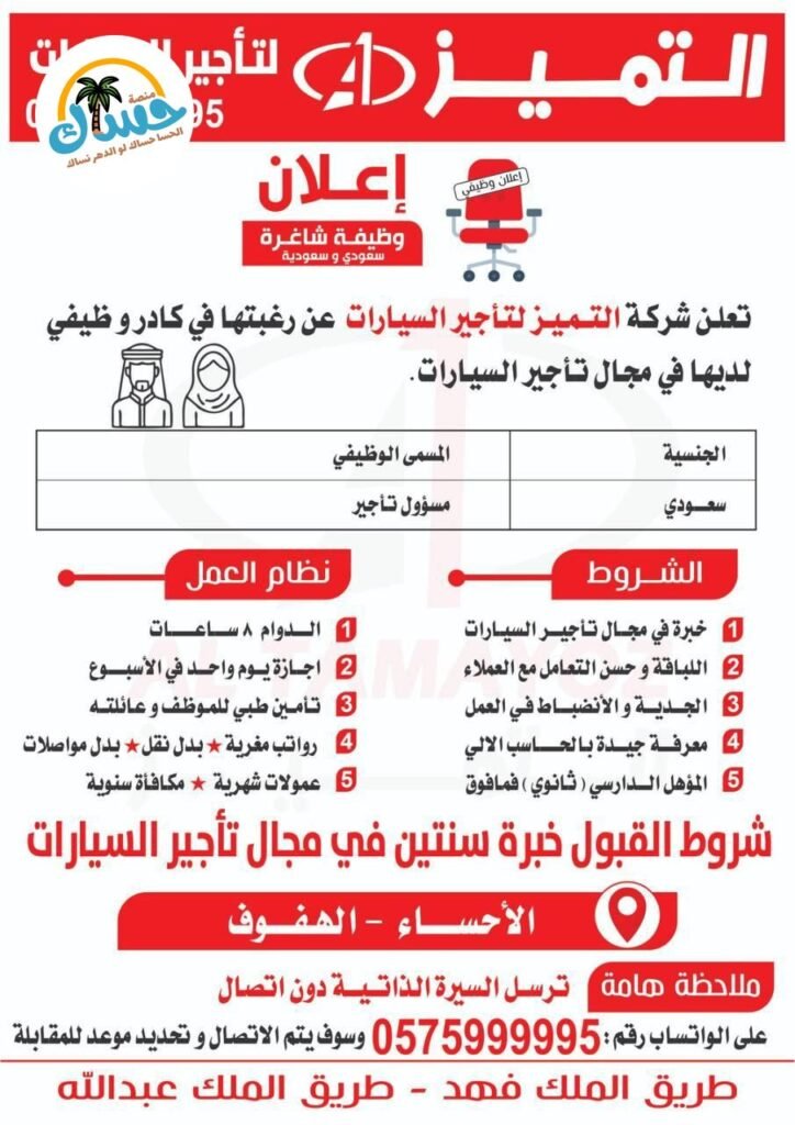 تعلن شركة التميز لتأجير السيارات عن رغبتها في ضم كادر وظيفي (رجالي ونسائي) للعمل في مجال تأجير السيارات بمدينة الأحساء.
