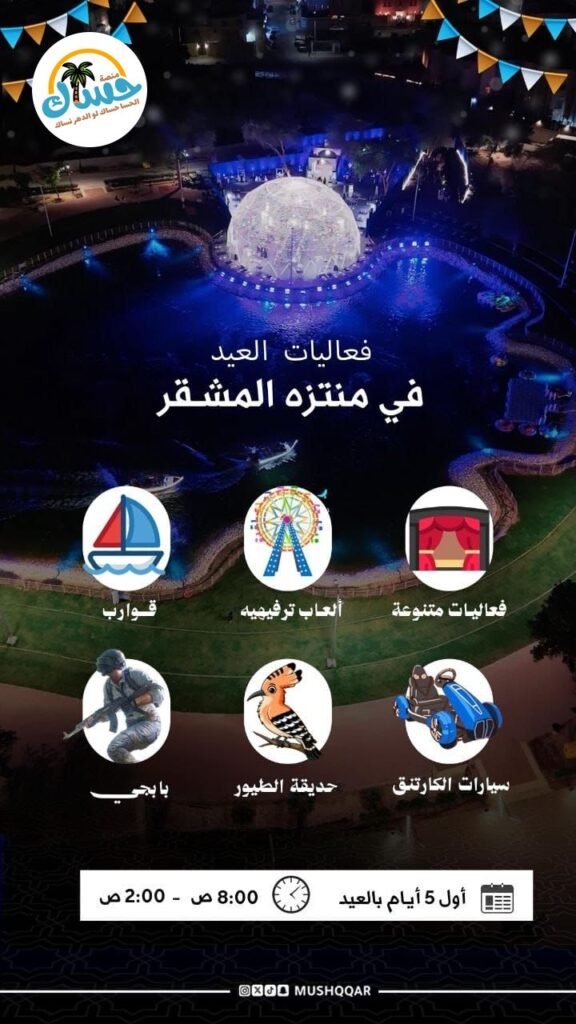 666; line-height: 1.8; margin: 10px 0; font-size: 1em;”>استمتع بأجواء عائلية مميزة للاحتفال بعيد الفطر في منتزه المشقر السياحي. يضم المنتزه أنشطة متنوعة تشمل قوارب، ألعاب ترفيهية، حديقة طيور، وسيارات الكارتنغ. الفعاليات ستقام خلال الأيام الخمسة الأولى من عيد الفطر.