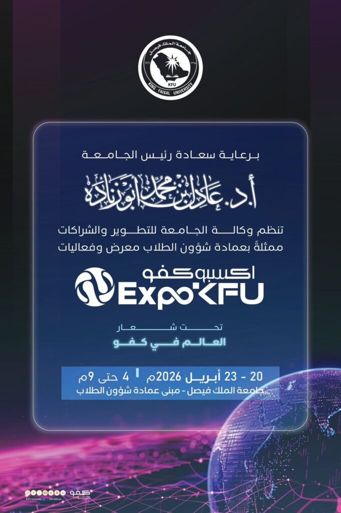 ﺑﺮﻋﺎﻳﺔ سعادة رﺋﻴﺲ الجامعة الأستاذ الدكتور ﻋﺎدل ﺑﻦ ﻣﺤﻤﺪ أﺑﻮ زناده، ﺗﻨﻈﻢ وكالة الجامعة للتطوير والشراكات ممثلةً بعمادة ﺷﺆون اﻟﻄﻼب ﻣﻌﺮض وﻓﻌﺎﻟﻴﺎت " اﻛﺴﺒﻮ كفو" ﺗﺤﺖ ﺷﻌﺎر "العالم في كفو".