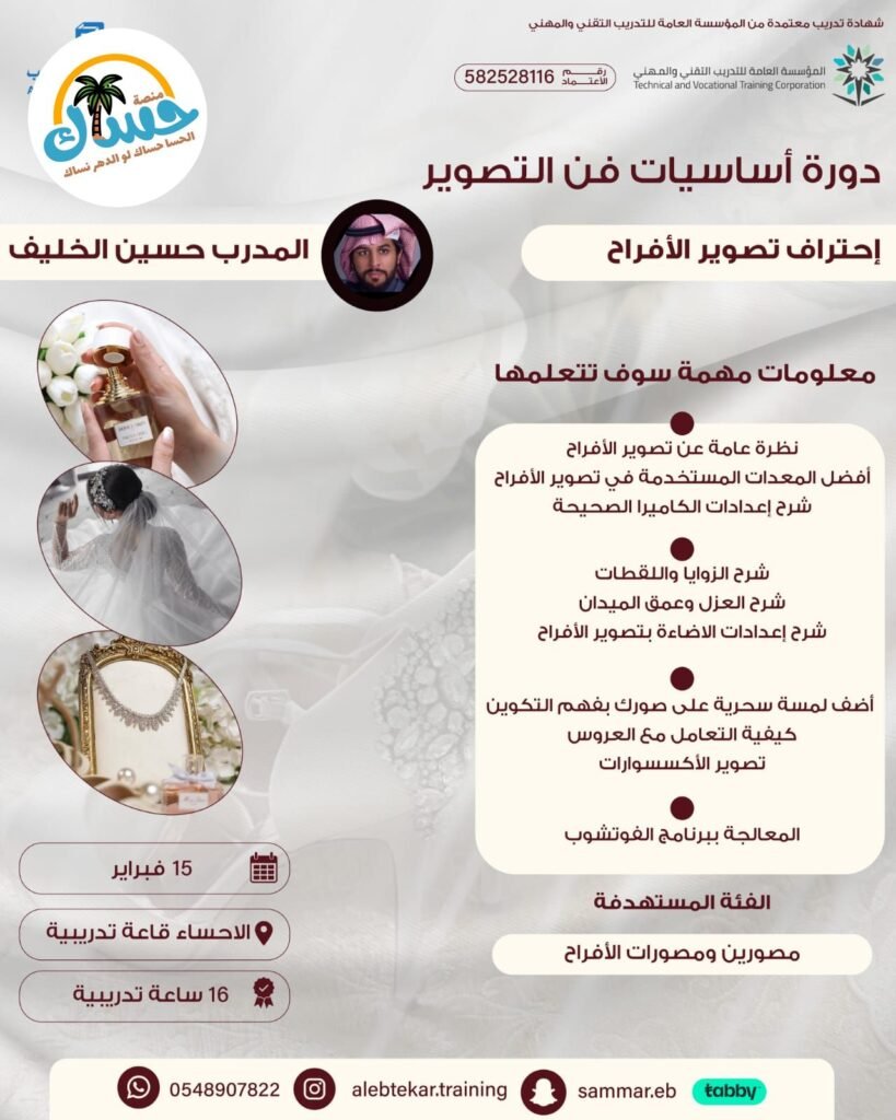 ورشة تدريبية مميزة مع التركيز على احتراف تصوير الأفراح. يقدمها المدرب حسين الخليف وتهدف إلى تنمية مهارات مصوري ومصويرات الأفراح. التاريخ: 15 فبراير، مدة 16 ساعة تدريبية. الموقع: الأحساء، قاعة تدريبية.