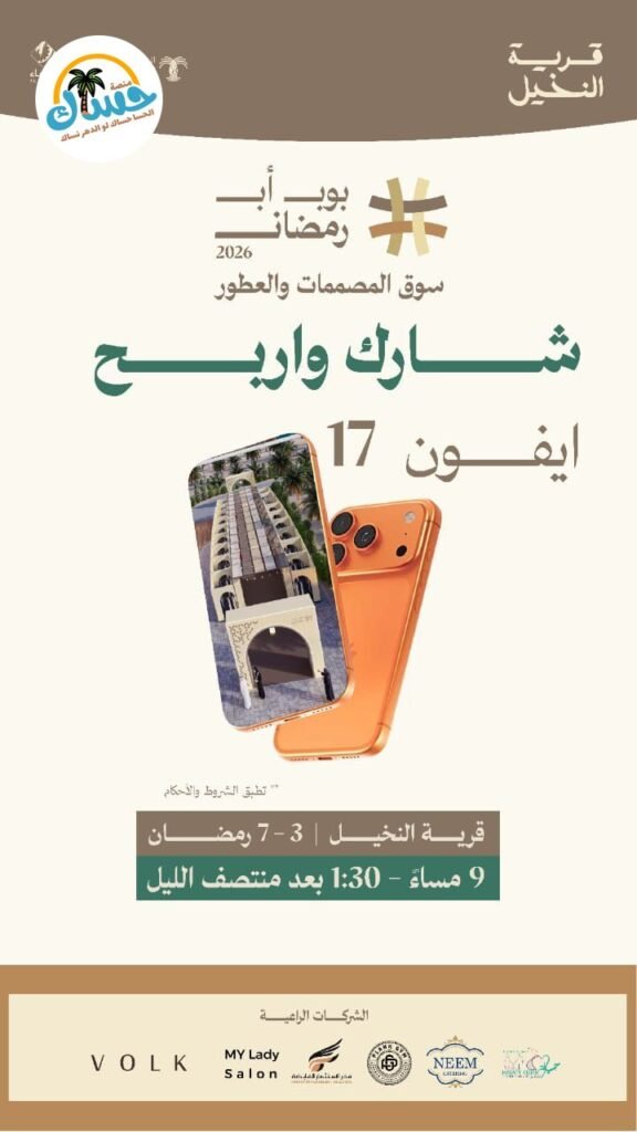 سوق للمصممات والعطور في قرية النخيل، من 3 إلى 7 رمضان، من الساعة 9 مساءً وحتى 1:30 بعد منتصف الليل. فرصة للمشاركة والفوز بهاتف آيفون 17 (تطبق الشروط والأحكام).
