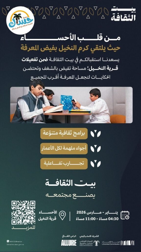 تقدم مجموعة متنوعة من الأنشطة الثقافية في قرية النخيل بالأحساء. الفعالية تشمل برامج ثقافية متنوعة، أجواء ملهمة، وتجارب تفاعلية لجميع الأعمار.