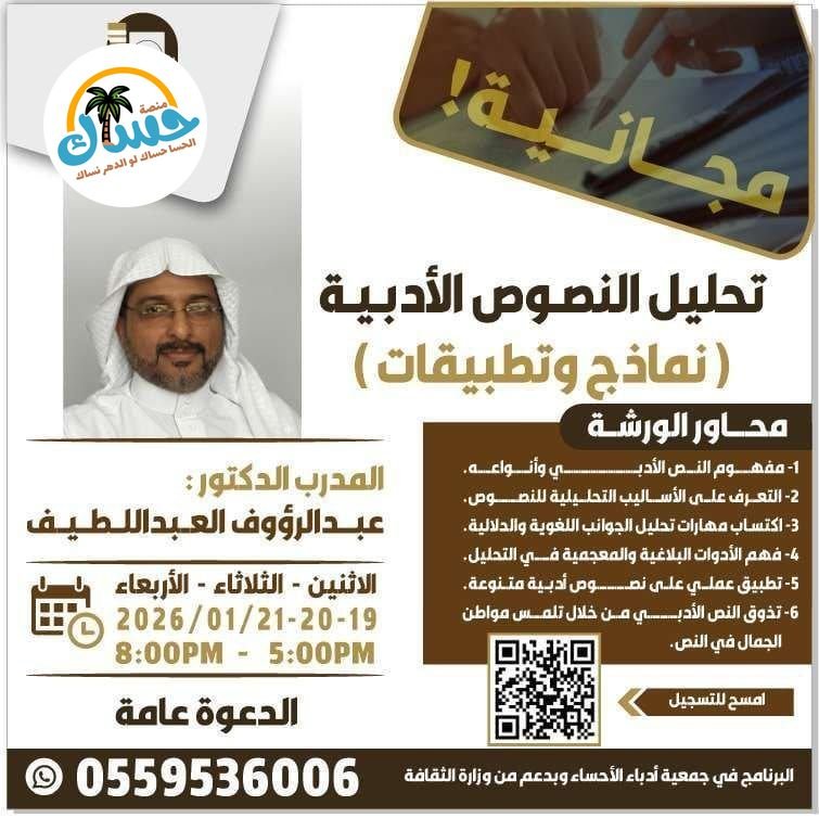 تنظمها جمعية أدباء الأحساء بدعم من وزارة الثقافة. المدرب: الدكتور عبد الرؤوف العبد اللطيف. الموعد: أيام الاثنين والثلاثاء والأربعاء، 19-20-21 يناير 2026، من الساعة 5:00 مساءً إلى 8:00 مساءً. المكان: جمعية أدباء الأحساء. التسجيل: عبر مسح رمز QR المرفق في الإعلان أو الاتصال بالرقم 0559536006.