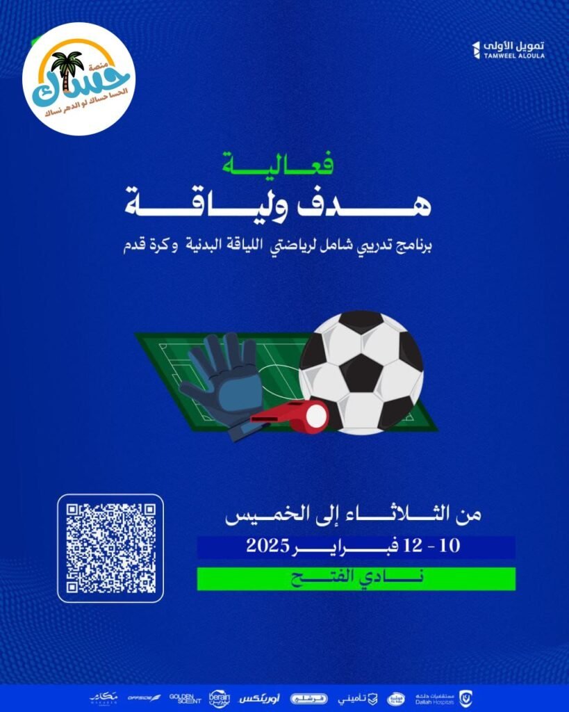 برنامج تدريبي شامل يركز على اللياقة البدنية وكرة القدم. الموعد: من الثلاثاء إلى الخميس، 10 – 12 فبراير 2025. المكان: نادي الفتح.