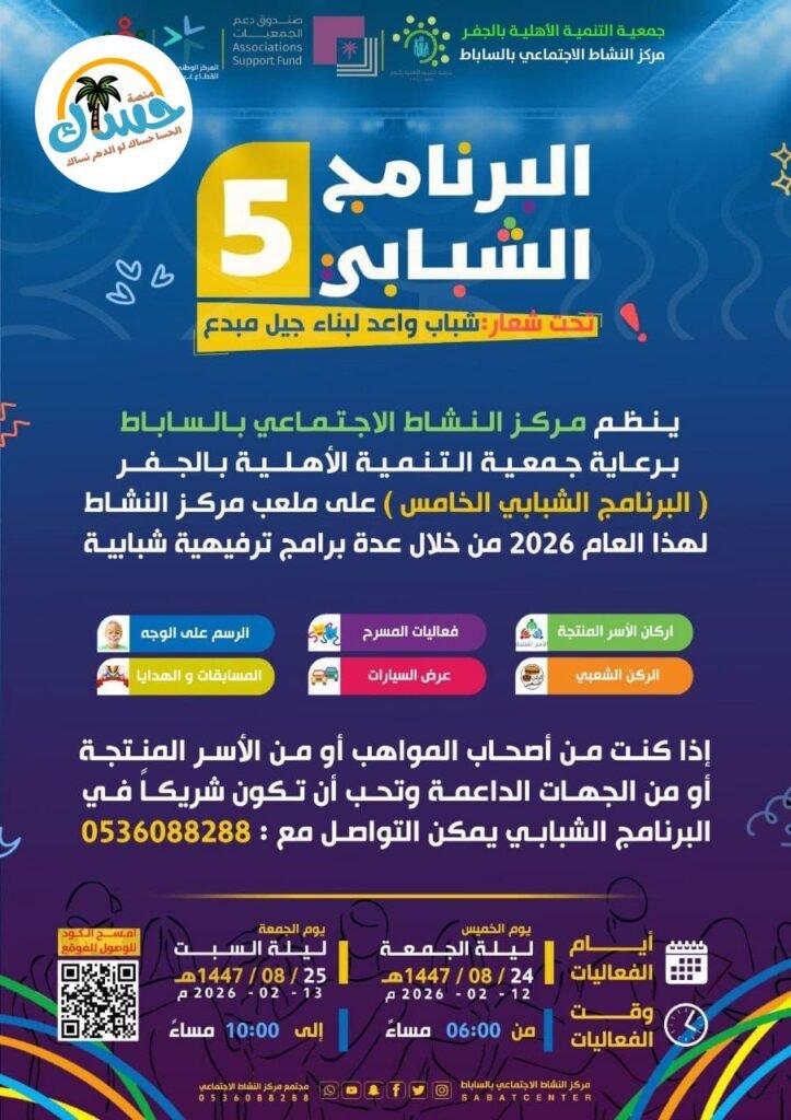ينظمه مركز النشاط الاجتماعي بالساباط برعاية جمعية التنمية الأهلية بالجفر، الفعاليات الترفيهية والشبابية المتنوعة المقررة لعام 2026.