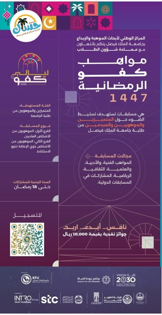 666; line-height: 1.8; margin: 10px 0; font-size: 1em;”>يعلن المركز الوطني لأبحاث الموهبة والإبداع بجامعة الملك فيصل عن تنظيم مسابقات ليالي كفو الرمضانية لعام 1447هـ لطلاب الجامعة الموهوبين والمتميزين. تتنوع مجالات المسابقة لتشمل المواهب الفنية، الأدبية، العلمية، الثقافية، والرياضية.