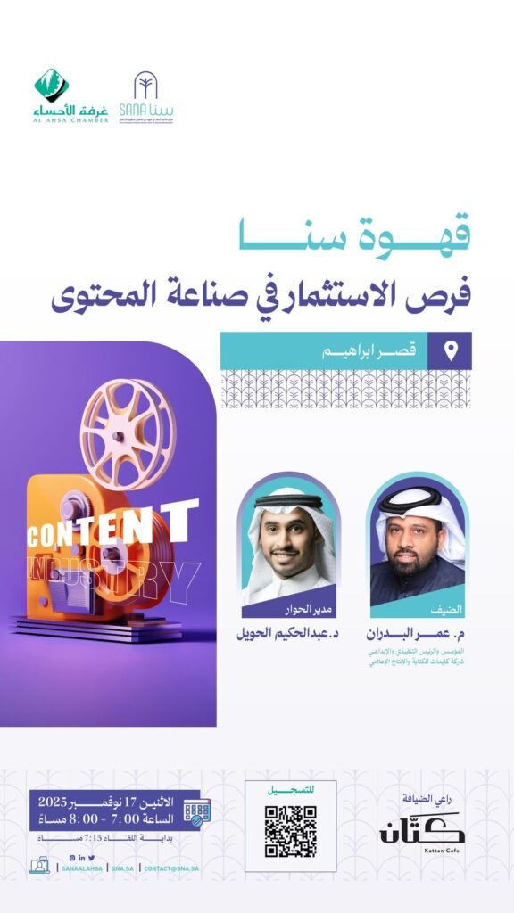 تدعوكم قهوة سنا لحضور حوار عن فرص الاستثمار في صناعة المحتوى.