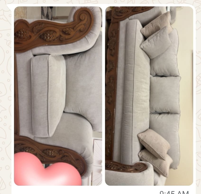 كنب للبيع، لونه بيج فاتح، تم تنجيده قبل شهر واحد. الخشب فيه بعض الخدوش وتغير لون بسيط.