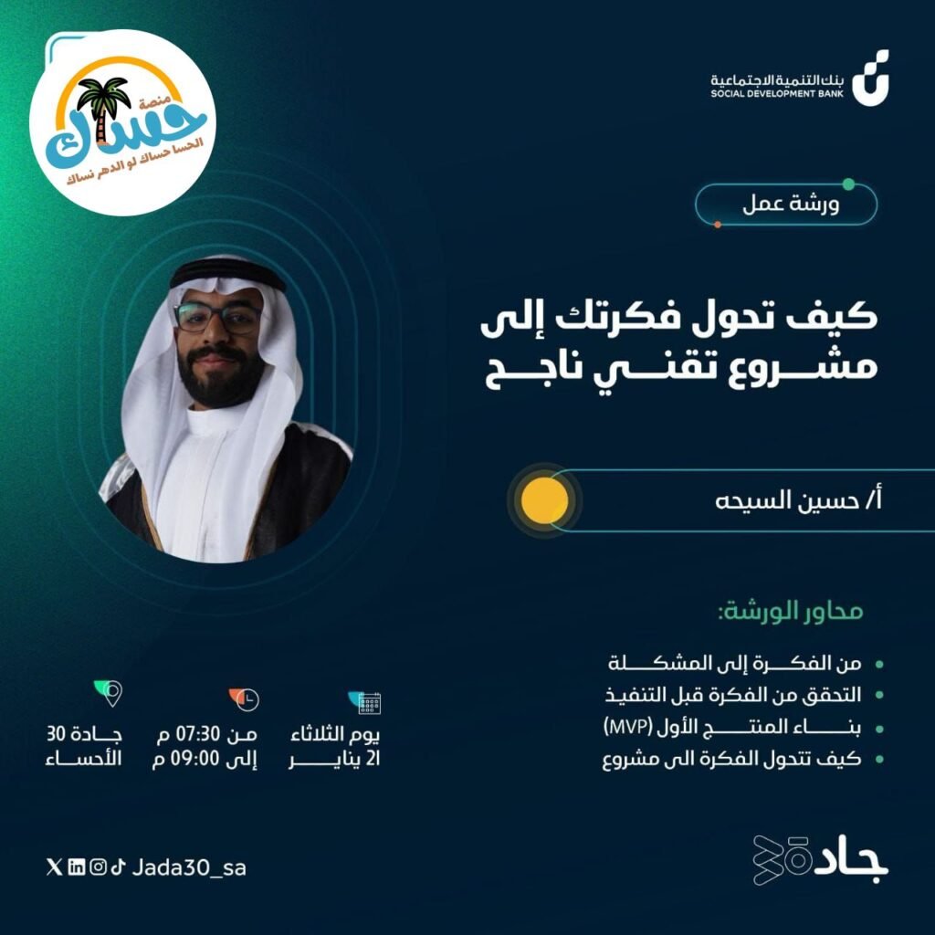 تقدمها أ/ حسين السيحه. ستتناول الورشة محاور مهمة مثل: من الفكرة إلى المشكلة، التحقق من الفكرة قبل التنفيذ، بناء المنتج الأول (MVP)، وكيف تتحول الفكرة إلى مشروع. المكان: جادة 30، الأحساء. الزمان: يوم الثلاثاء، 21 يناير، من 07:30 مساءً إلى 09:00 مساءً.