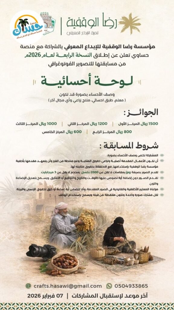 ندعوكم للمشاركة في مسابقة التصوير الفوتوغرافي التي تهدف إلى وصف الأحساء بصورة.