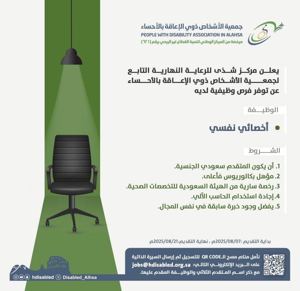 مطلوب أخصائي نفسي لدي مركز شذي للرعاية النهارية.