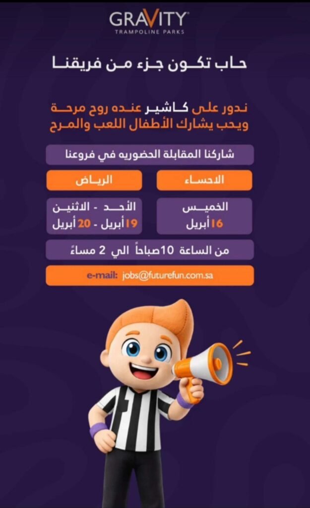 مطلوب كاشير (موظف صندوق) بفروع Gravity Trampoline Parks في الأحساء الرياض
