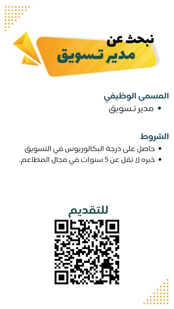 مطلوب مدير تسويق لمجال المطاعم 👌👌المؤهل العلمي: الحصول على درجة البكالوريوس في التسويق. 🔥🔥الخبرة: خبرة لا تقل عن 5 سنوات في مجال المطاعم. 👈👈للتقديم: يرجى مسح رمز الاستجابة السريعة (QR Code) الموضح في الصورة للتقدم للوظيفة.