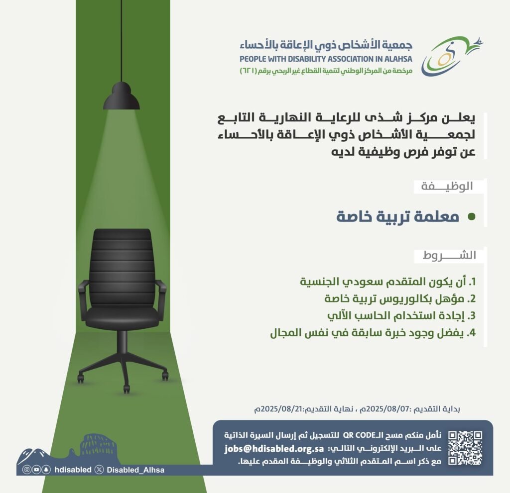 مطلوب معلمة تربية خاصة لدي مركز شذي للرعاية النهارية.