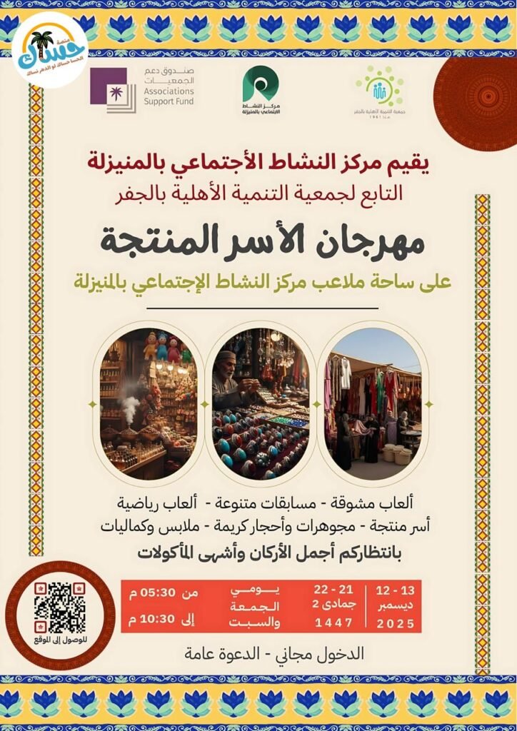 سيقام هذا الأسبوع لمدة يومان أبتداءً من يوم الجمعة وذلك بتاريخ 12 / 12 / 2025 في ساحة ملاعب مركز النشاط الاجتماعي بالمنيزلة. ترقبوا فعالياتنا مع مشاركة كبيرة من الأسر المنتجة وأركان كبيرة ومتنوعة ومميزة. لا تفوتوا الفرصة الدخول مجاني تعال واستمتع مع من تحب!