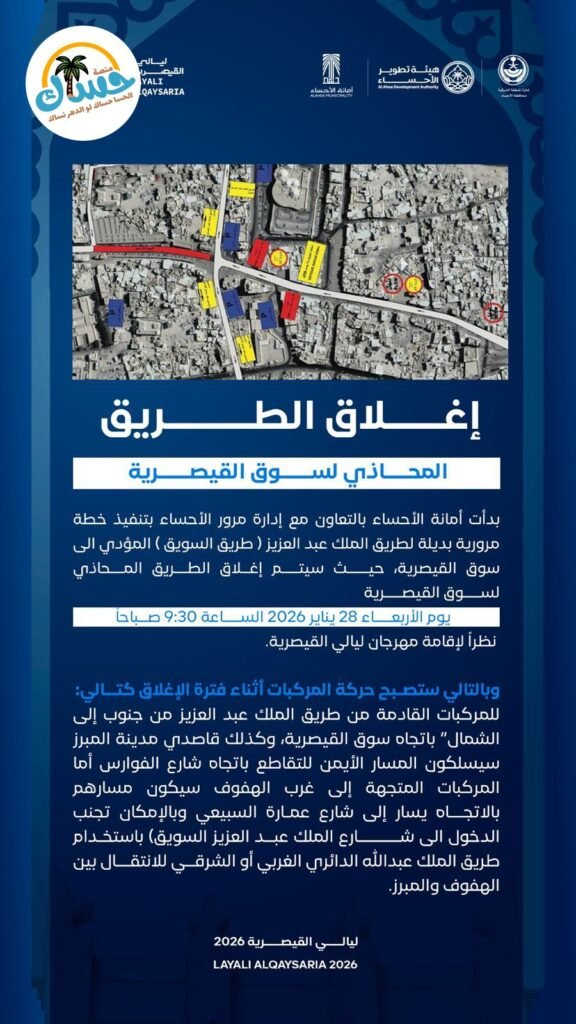 يمتد الإغلاق على الطريق المحاذي لسوق القيصرية بسبب إقامة مهرجان ليالي القيصرية. للمركبات القادمة من جنوب طريق الملك عبد العزيز باتجاه سوق القيصرية، يجب سلوك المسار الأيمن عند التقاطع باتجاه شارع الفوارس. ولمركبات المتجهة إلى غرب الهفوف، سيكون المسار باتجاه اليسار إلى شارع عمارة السبيعي. لتجنب الدخول إلى شارع الملك عبد العزيز، يمكن استخدام طريق الملك عبد الله الدائري الغربي أو الشرقي للتنقل بين الهفوف والمبرز.