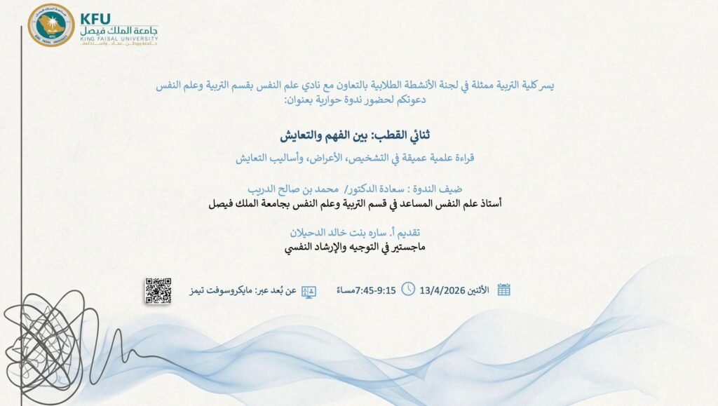 - ندوة حوارية بعنوان "ثنائي القطب: بين الفهم والتعايش" 👌👌تنظمها كلية التربية بجامعة الملك فيصل بالتعاون مع نادي علم النفس.