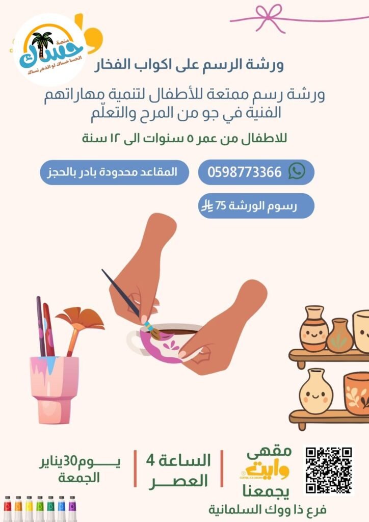تهدف إلى تنمية مهارات الأطفال الفنية في جو من المرح والتعلم. الفئة العمرية: للأطفال من 5 إلى 12 سنة. رسوم الورشة: 75 ريالاً. للتواصل والحجز: 0598773366.